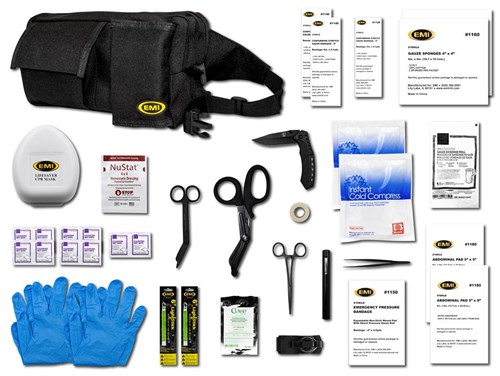 EMI's E.T.R.™ Basic Response Kit is ideal for instant preparation for any active shooter, gunshot situation, or tactical emergency. Crafted from 1000 Denier Cordura Nylon, a material known for its durability,  the fanny pack has three outside and two large inside pockets to organize supplies and equipment. The adjustable nylon webbing can fit waists from 20" to 54" and has a quick-release buckle.