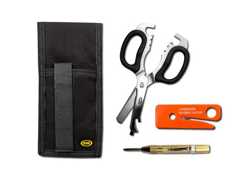 EMI's Rescue-Tec™ Holster Set has all the essential rescue tools you'll need. It features our Multipurpose Rescue Shears™ Eleven tools in one (see diagram description) made of hardened stainless steel with high-impact reinforced plastic handles. Also included is the Lifesaver™ Seat Belt Cutter and our standard window punch with clip. The holster is crafted from water-repellent 1000 Denier Cordura Nylon. It's padded with extra cushioning foam and is double-stitched with heavy nylon thread. It features a snap belt loop, reinforced Velcro closure, and two large instrument pockets. This holster can accommodate belts up to 2" wide.